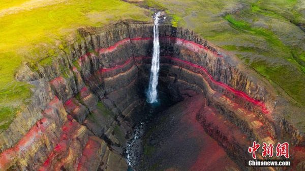 2020年9月27日訊(具體拍攝時間不詳),冰島,航拍照片显示瀑布流入一個五顏六色的峽谷。這個128米深峽谷的懸崖由玄武岩地層、紅色粘土和針恭弘=叶 恭弘樹的樹榦化石組成。攝影師Hugo Healy造訪Hengifoss瀑布時拍攝下這一景象。 圖片來源:人民視覺