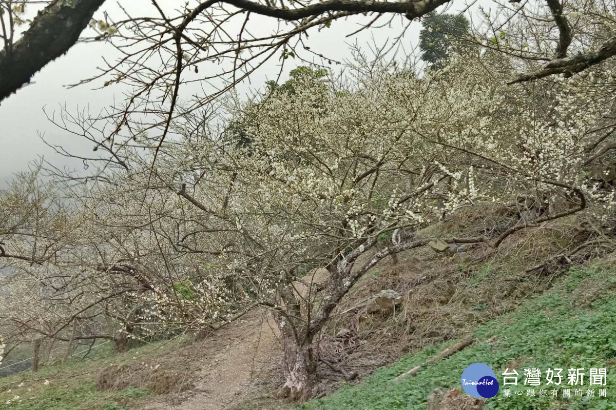 台南楠西山區梅嶺梅花盛開,整座山花開似蒙上一層白雪。(圖/返老還童南瀛區教練黃淑華提供)