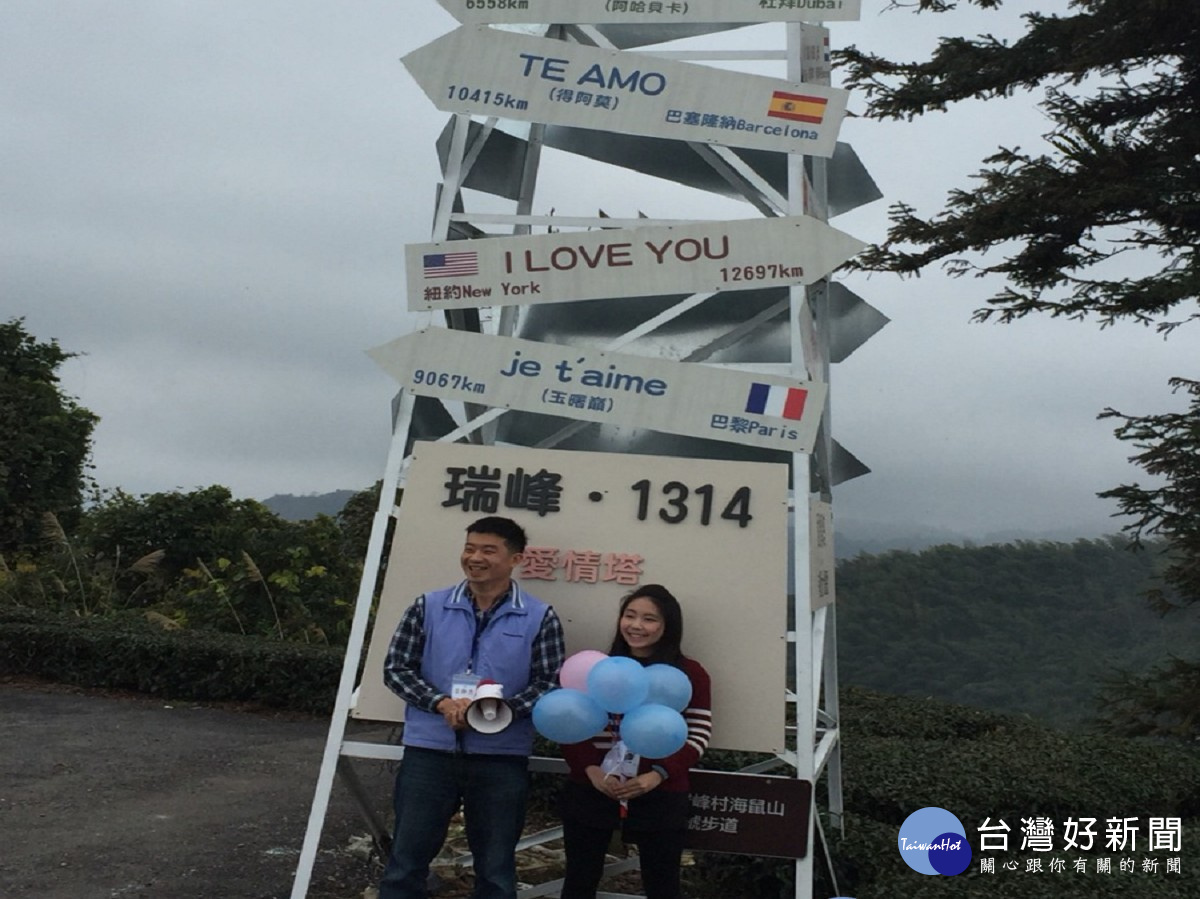 交通部觀光局阿里山國家風景區管理處和梅山鄉瑞峰社區合作,在眾多報名者中選出幸運的40位單身男女,在情人節前夕讓大家「愛要大聲說」,來到位於全台4處情人節必訪有「愛」景點-瑞峰1314觀景台-18國愛情塔,邁向追求2018幸福旅程。