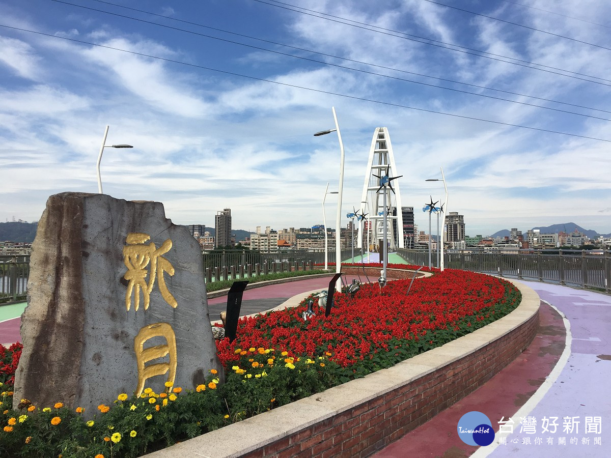 新月橋上各色各樣的花草隨風搖曳,新北市政府高灘地工程管理處於橋上種植約1萬4千餘株各色各樣的草花,市民朋友除了白天於橋面上散步漫遊賞花,而夜間則有彩色光雕與花朵輝印;高管處說,花期預計可維持至12月中,同時呼籲市民朋友們,賞花之餘也能珍惜愛護草花。