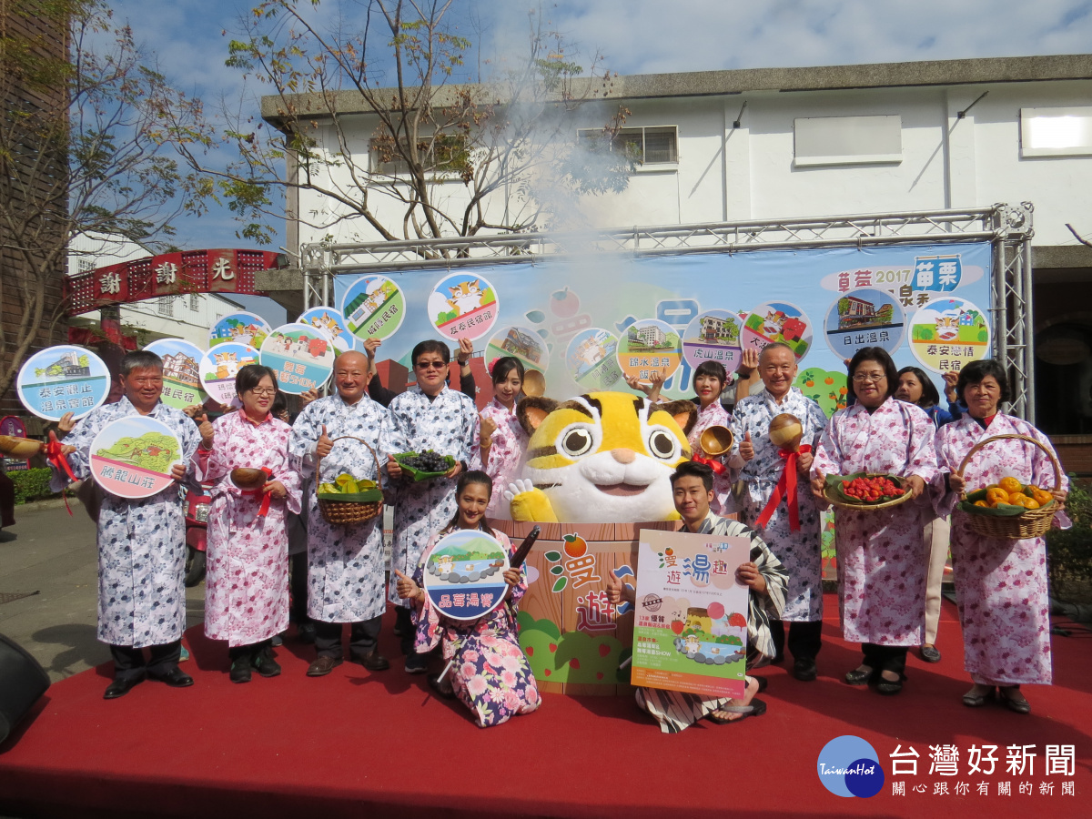 苗栗草莓溫泉季開跑,縣長等人著「溫泉袍」為活動宣傳。(記者許素蘭/攝)