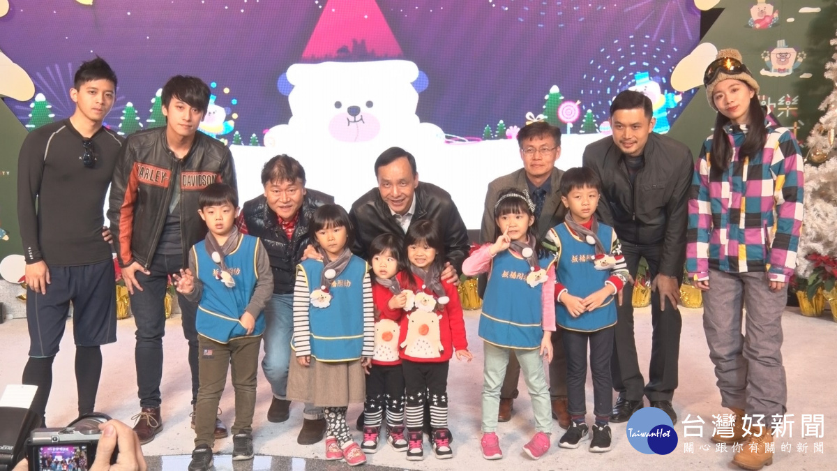 站在250吋銀幕前揮揮手,新北市長朱立倫和幼稚園小朋友開心迎接桑塔熊,結合時下最夯的AR擴增實境,市府把1樓大廳打造成馬戲團樂園,讓新北耶誕城吉祥物和大小朋友近距離互動。